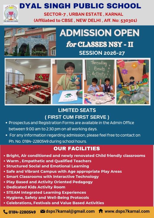 The Dyal Singh trust started its first school and later as it progressed branched off to have other schools too. From the time of inception to the present day Dyal Singh Public School, Sec-7 has progressed immensely. The School is situated over a sprawling acre of 5.6 acres of land. The building is divided into 2 parts -the junior block and the senior block adjoined by the administrative block. The school houses classes from Nursery grade to 12th grade. The preparatory classes are beautifully decorated with animated characters and fairy tales to suit the imaginations of the tiny tots.